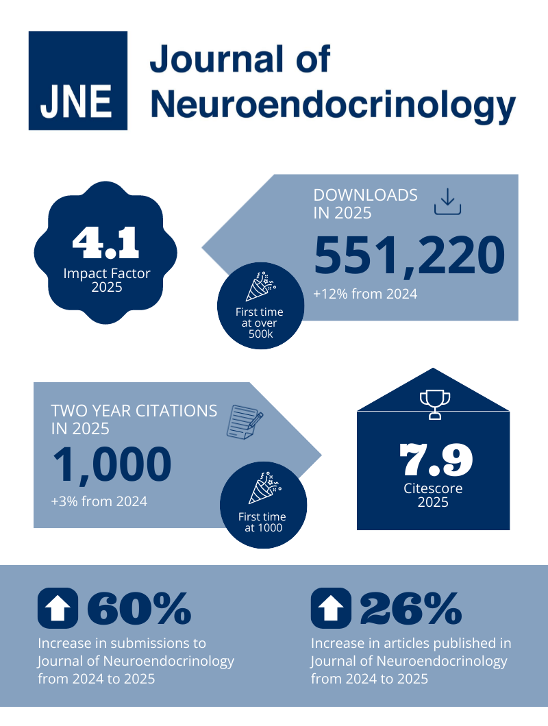 The JNE editorial team are very proud that our journal is now recognised as the leading journal in our field, with an Impact Factor of 4.1, ahead of many other key journals (including Endocrinology, Journal of Endocrinology, and Journal of Neuroscience), and a Citescore of 7.9. This is the result of years of strategic planning, with editors, past and present, working with Wiley, the British Society for Neuroendocrinology (BSN) Committee and BSN staff. In 2017, we set a target of 4 for the 2024 Impact Factor and – bingo! – we exceeded it. Two-year citations topped 1000 for the first time (968 in 2024; 858 in 2023). The 2025 online usage also set a record, with full text downloads exceeding 500k for the first time, reaching 552k (493k in 2024; 417k in 2023). Submissions increased by a huge 60% in 2025, and articles published by 26%. All of this is very rewarding for those of us who have been working hard on JNE for a number of years. The financial results are also keeping pace, which is far from what many societies are experiencing.